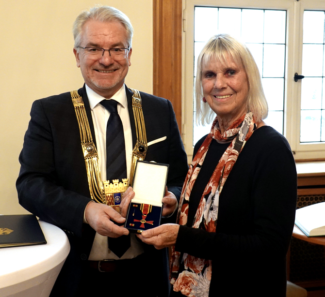 “Oberbürgermeister Marc Buchholz (Mülheim/Ruhr) überreicht Ulrike Stender das Bundesverdienstkreuz“