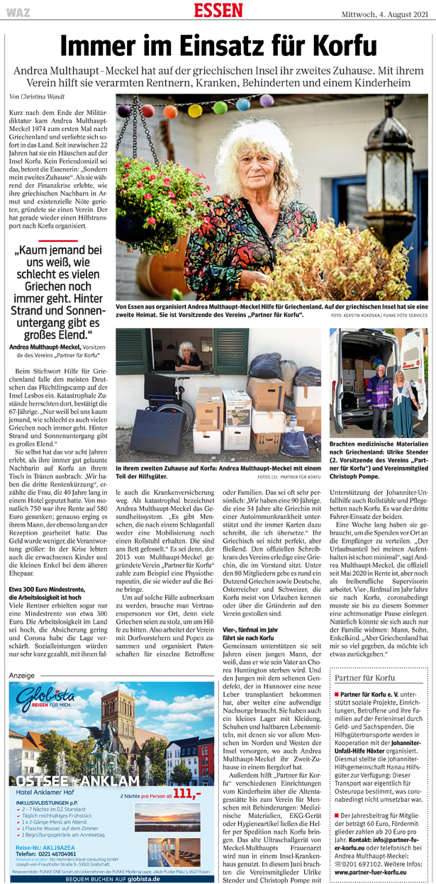 Ulrike Stender, 2. Vorsitzende von Partner für Korfu e.V. hat das Bundesverdienstkreuz von Bundespräsident Walter Steinmeier verliehen bekommen. Damit wird ihr jahrelanges, ehrenamtliches Engagement im sozialen Bereich gewürdigt.