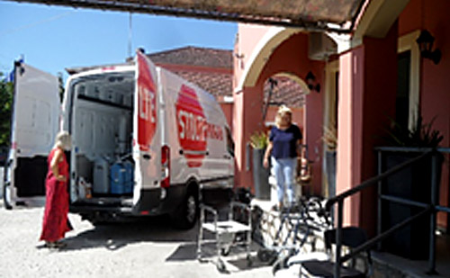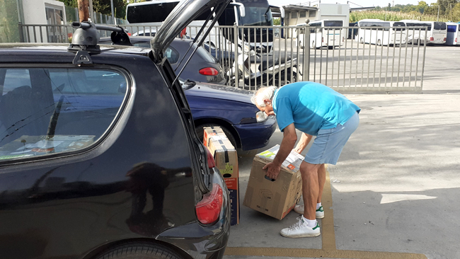 Mit Hilfe der Firma „Hellas Travel“ aus Düsseldorf konnte ein großer Transporter mit den unterschiedlichsten Hilfsgütern gefüllt werden, die sich über einen längeren Zeitraum angesammelt hatten. Die Fracht wurde nach Igomenitsa gebracht und von dort mit der korfiotischen Firma „Georgakis Trans“ zu unserem Lager nach Pagi transportiert. Beide Transportfirmen kamen uns preislich sehr entgegen. Nach kurzer Lagerung und Sortierung wurde ein Teil der Spenden zeitnah zu unseren Partnerorganisationen ausgeliefert.
